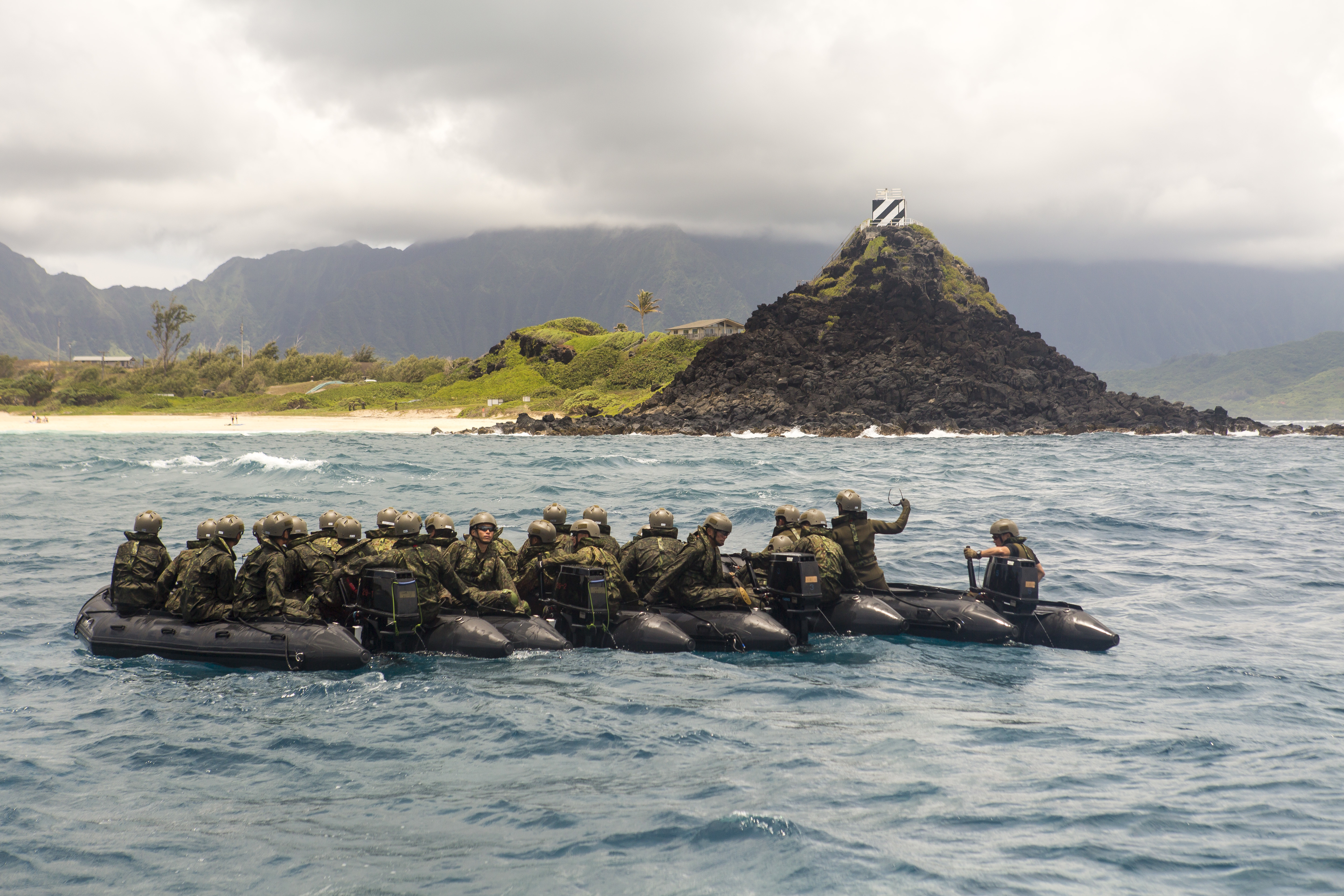 Australian soldiers with the Royal Australian Regiment ride in a Zodiac Mark 2 Grand Raider general purpose inflatable boat during a beach insertion rehearsal as part of Rim of the Pacific (RIMPAC) exercise Marine Corps Base Hawaii July 1, 2018. RIMPAC provides high-value training for task-organized, highly-capable Marine Air-Ground Task Force and enhances the critical crisis response capability of U.S. Marines in the Pacific. Twenty-five nations, 46 ships, five submarines, about 200 aircraft and 25,000 personnel are participating in RIMPAC from June 27 to Aug. 2 in and around the Hawaiian Islands and Southern California.