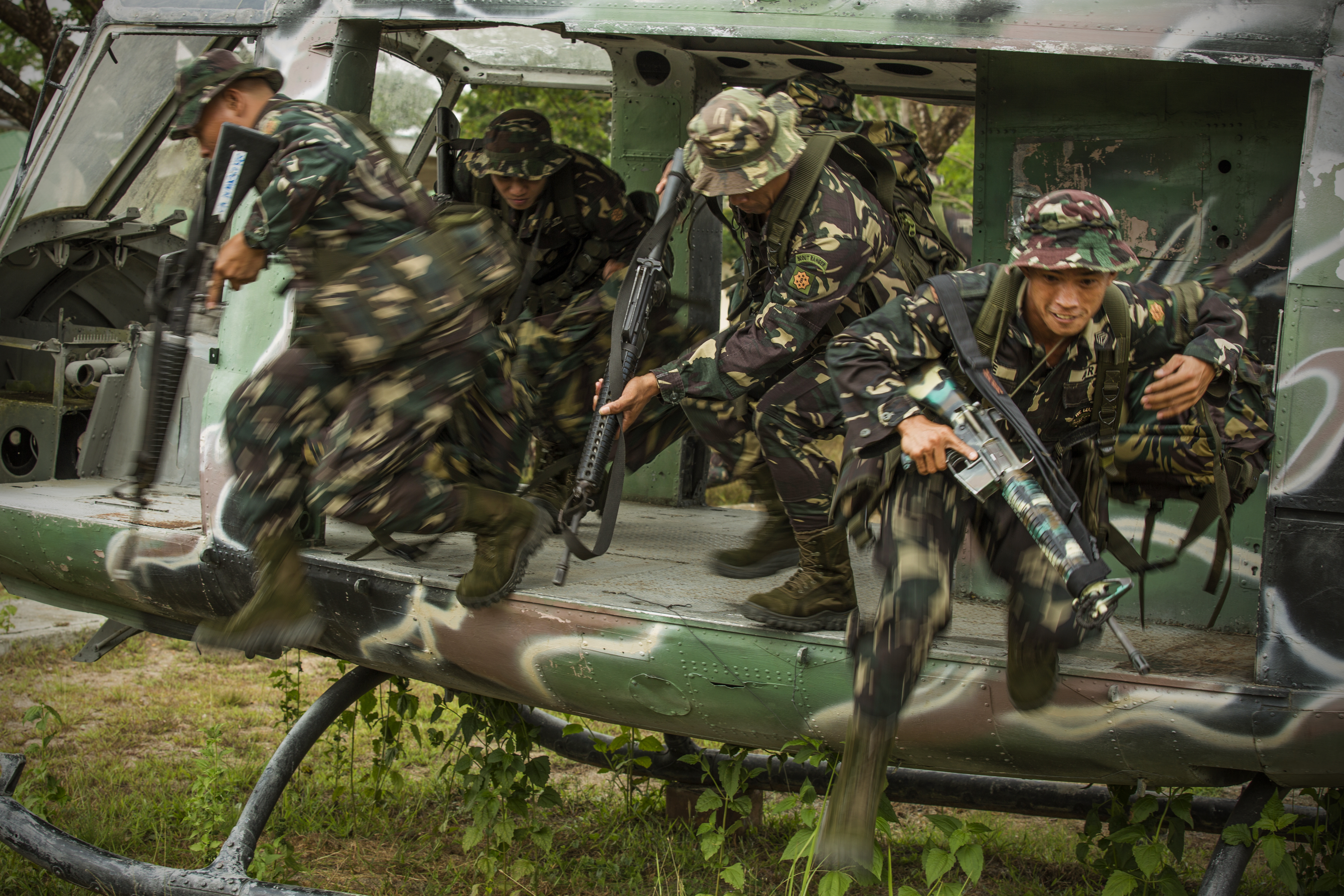 Philippines Army Soldiers exit a grounded training helicopter during helicopter insert and extract training with U.S. Army Soldiers on Fort Magsaysay, Philippines, April 29, 2014. Philippine and U.S. Army personnel are preparing for an upcoming field training exercise during Balikatan 2014. This year marks the 30th iteration of the exercise, which is an annual Republic of the Philippines-U.S. military bilateral training exercise and humanitarian civic assistance engagement.
