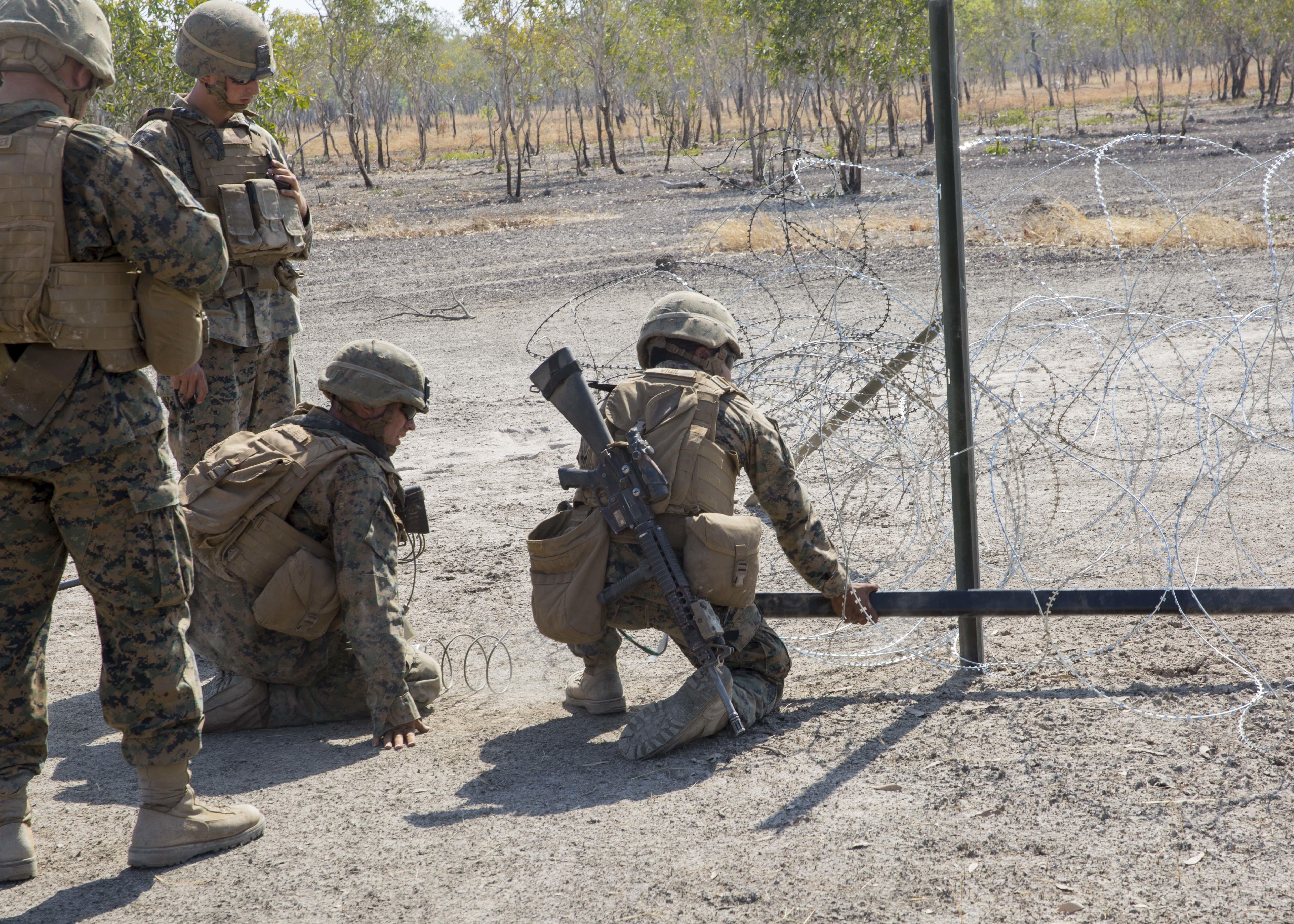 U.S. Marines with 3rd Combat Assault Battalion, Marine Rotational Force – Darwin, set a demolition charge in concertina wire during a training exercise Aug. 21 at Mount Bundey Training Area, Northern Territory, Australia. Combat engineers with MRF-D conducted the demolition to familiarize Marines with tactics, techniques and procedures to safely use the explosives. The rotational deployment in Darwin enables Marines to more effectively train, exercise and operate with their partners, enhancing regional security and building a capacity to respond more rapidly to natural disasters and crises throughout that region.